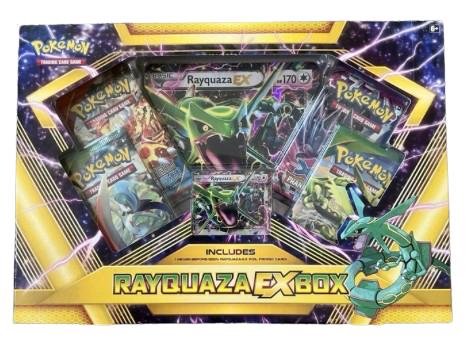 Condición: Sellado de fábrica Estado general:Rayquaza EX Box – Roaring Skies (Inglés) completamente nueva, con empaque original intacto y sello plástico de fábrica sin abrir.